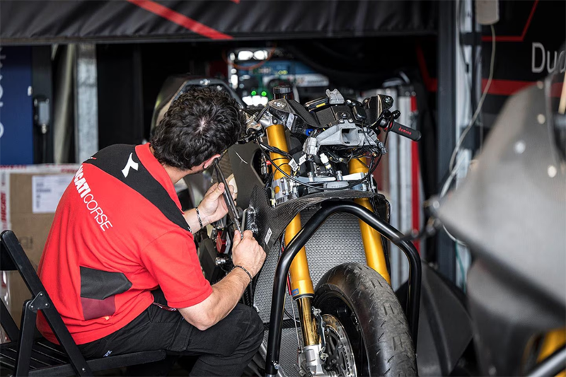 A Ducati tech prepares a spare bike ahead of race 1 at Mugello.