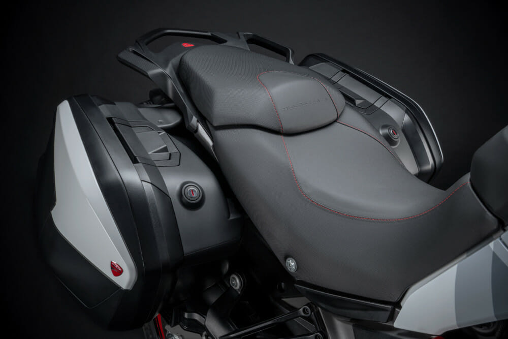The new 2021 Multistrada 950 S livery adds sportiness to the elegant lines, with a MotoGP-inspired graphic and a color scheme that alternates white, grey and Ducati Red.