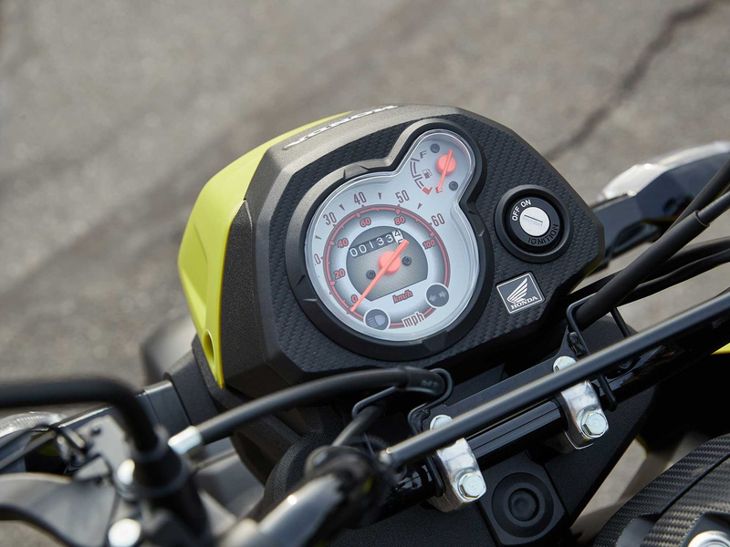 Access to the 0.9-gallon fuel tank is through a keyed door just behind the steering head; Honda is claiming 110 mpg from the Navi, so it should be able to travel a good distance before needing a five-spot to fill up. There’s a fuel gauge next to the speedometer, but since the Navi uses a 16mm carburetor, it also has a reserve setting on the fuel tank petcock (remember those?). Honda also says that the engine only needs an oil change every 2,500 miles, and the air filter every 10,000 miles.