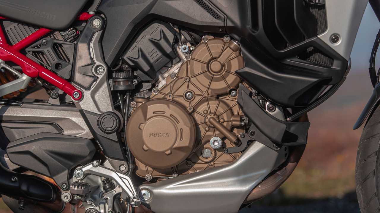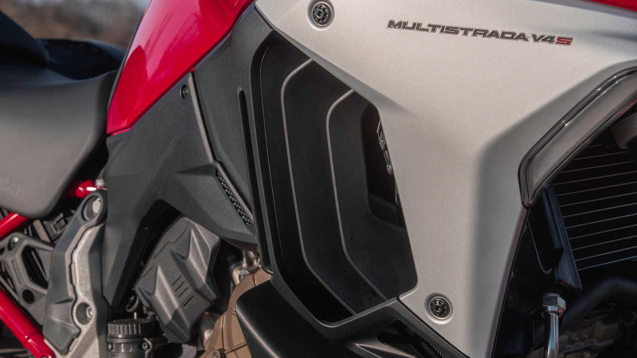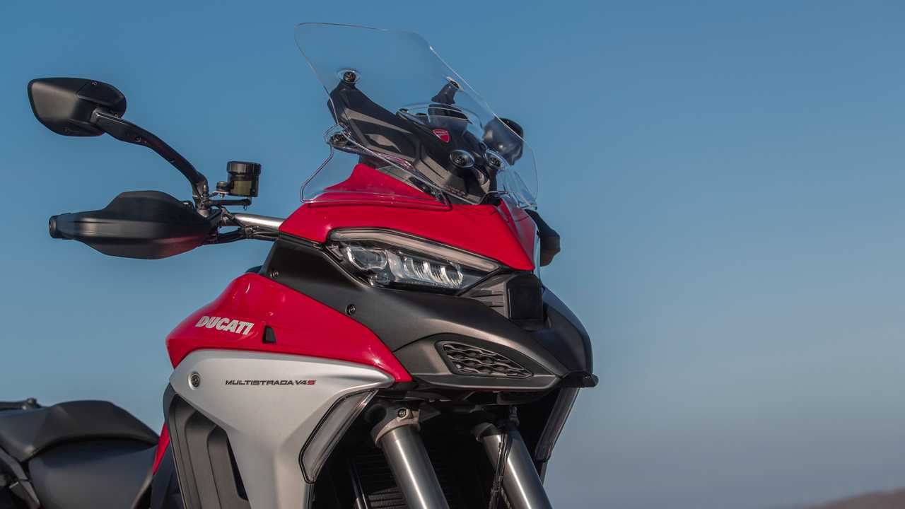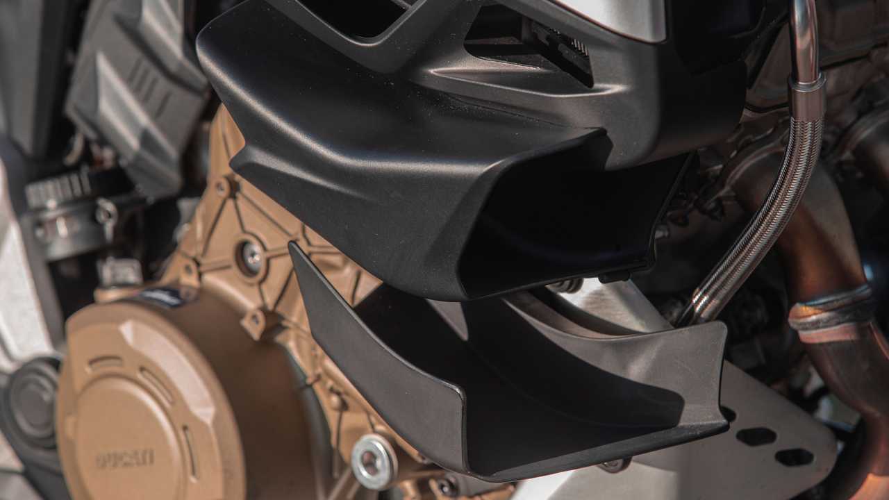 The optics remain undeniably “multimoto” with the dual headlamp, however, it’s now underlined by the daylight running lights that align the design with the other V4s in the family. While the beak and 5.8-gallon fuel tank strengthen the model’s enduro personality, the new aerodynamic appendages integrated to the semi-fairing that diffuse the air away from the rider’s legs add muscle to the ensemble.