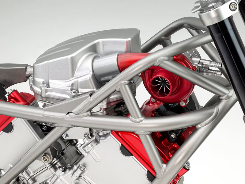 That supercharger promises all the benefits of forced induction with none of the downsides. Exhaust driven turbochargers have been largely ignored by motorcycle companies since the brief and unsuccessful spate of boosted bikes 40 years ago in the mid-’80s. Even with the latest generation of lightweight, fast-responding turbos, the instant connection that riders expect between a twist of the wrist and a reaction from the engine would be dulled by an exhaust-driven turbo. Superchargers have had more recent success, specifically on Kawasaki’s H2 models, but the use of centrifugal compressors means boost grows with revs, so they don’t add the slug of bottom-end torque that might be expected from an engine equipped with a blower.
