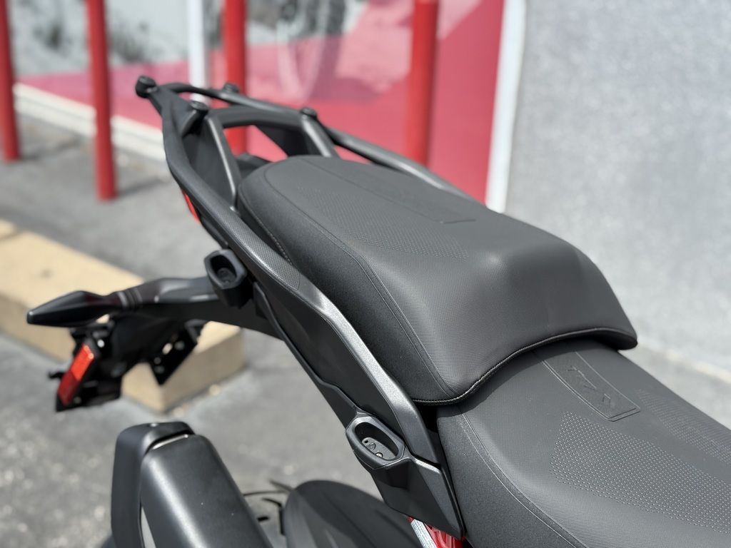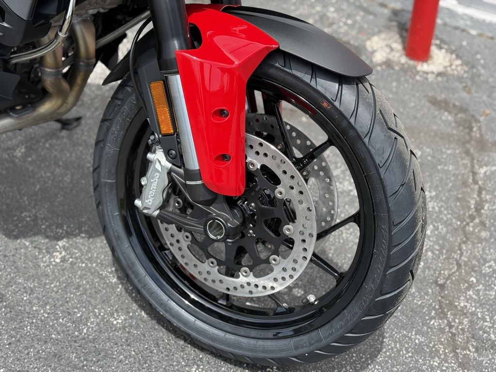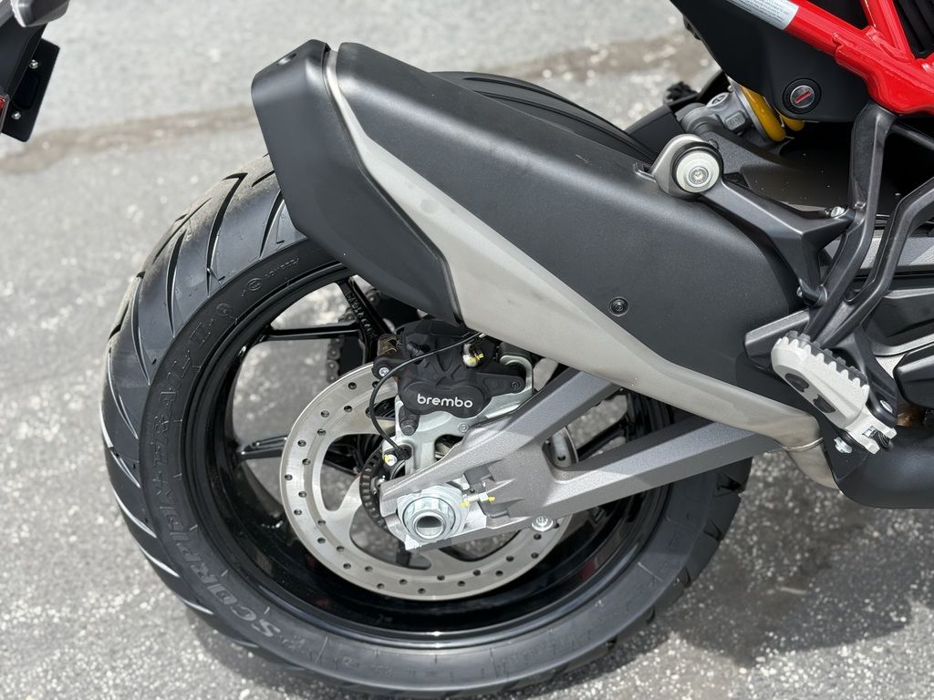 The aluminum monocoque frame is lightweight and compact, offering a solid base for precise and responsive riding. Thanks to the repositioning of the aluminum double-arm swingarm pivot, now 1 millimeter higher, the anti-squat effect has been enhanced, improving precision in trajectory, especially during sporty riding and under full load. The new forged rim, available in selected trims or as an accessory, is 4 lb. (2 kg)lighter than the spindle and improves handling by facilitating direction changes. Its lower rotating mass generates a reduced gyroscopic effect.