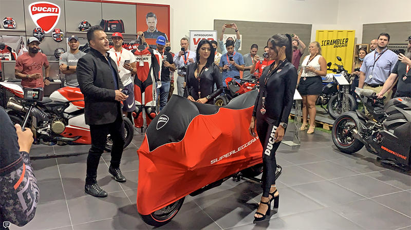 Carlos and the V1 umbrella girls about to unveil the first Ducati Superleggera V4 in Houston.