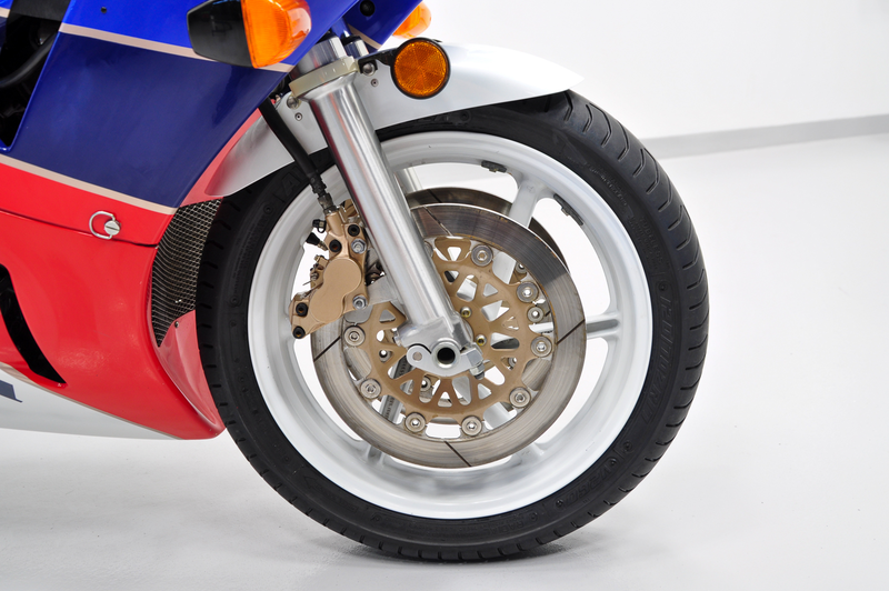 Of course, many (perhaps the majority) of RC30s were raced, and some converted back to road spec once their track days were over. Warped front discs are fairly common where bikes have been subjected to competition. The fairing appears to contain two slightly different shades of red, and many collectors make the mistake of having this repainted to match the color in the lower section. However, the truth of the matter is that the top section is actually a decal and was used by Honda to guard against having paint chipped by the three Dzus fasteners.