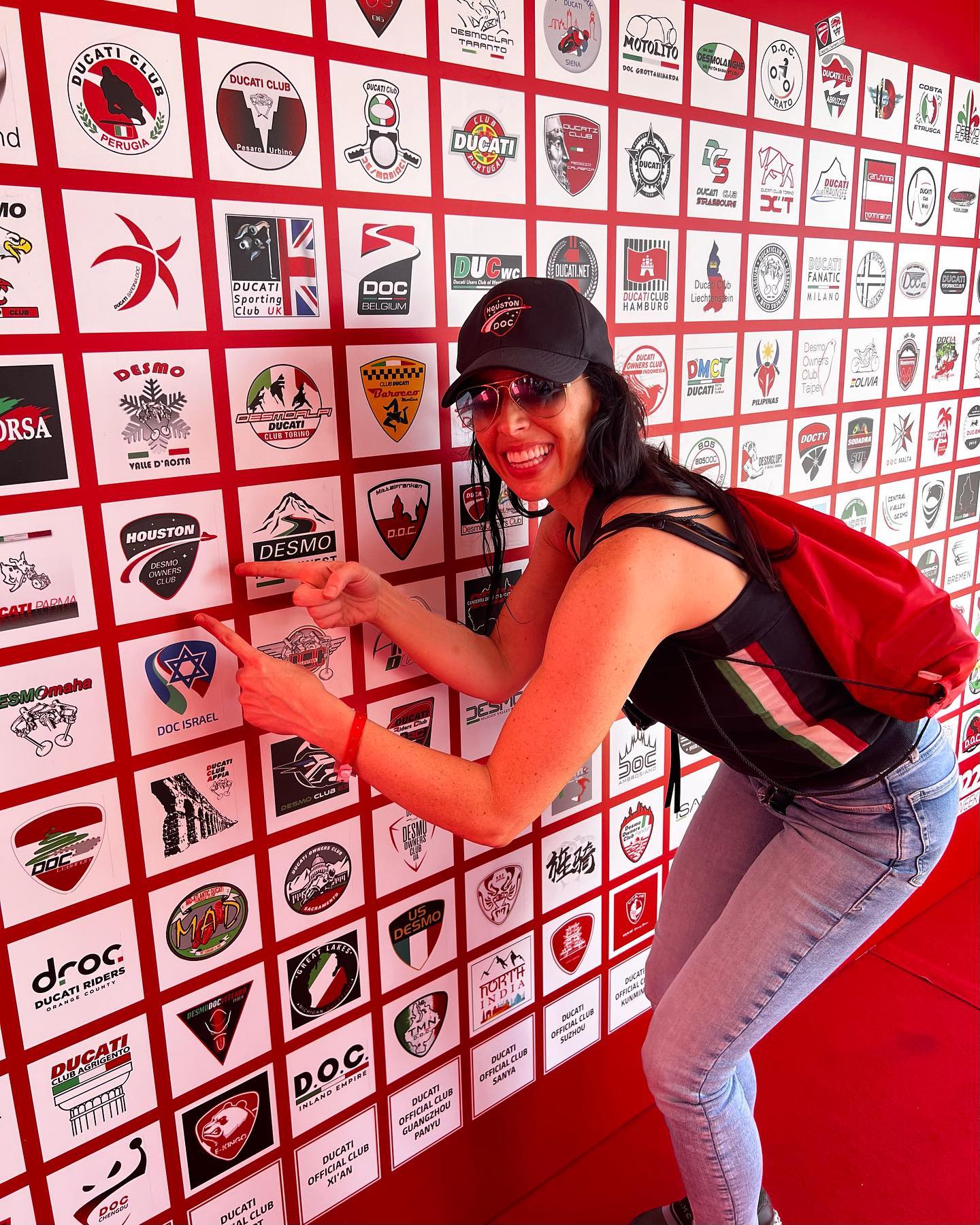 V1P, and President of the Houston Desmo Owners Club, Sara Cole points out our official club logo among all the ones from around the world. Ours is the best!