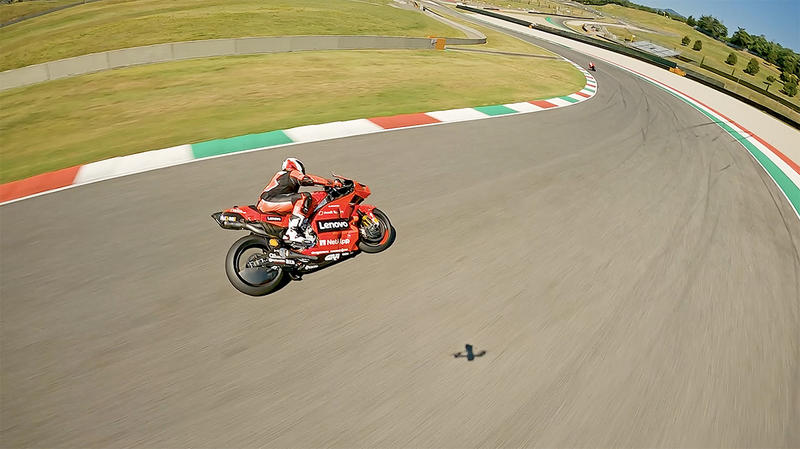 The video’s drone footage perfectly captures moments like this — trail-breaking into one of Mugello’s famous apex’s. We don’t want to spoil the video too much, but it didn’t seem like Carlos was shy with the throttle.